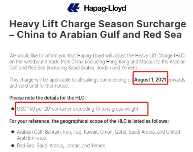 赫伯罗特日前发布公告,将调整从中国(包括香港和澳门)到阿拉伯湾和红海有效载荷费用(HLC),毛重超过15吨的每20英尺集装箱150美元。此费用将适用于2021年8月1日起开始的所有航行,有效期至另行通知。