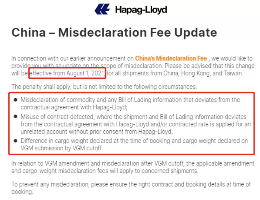 8月1日起,错误申报和滥用合同处以每个集装箱1250美元的罚款