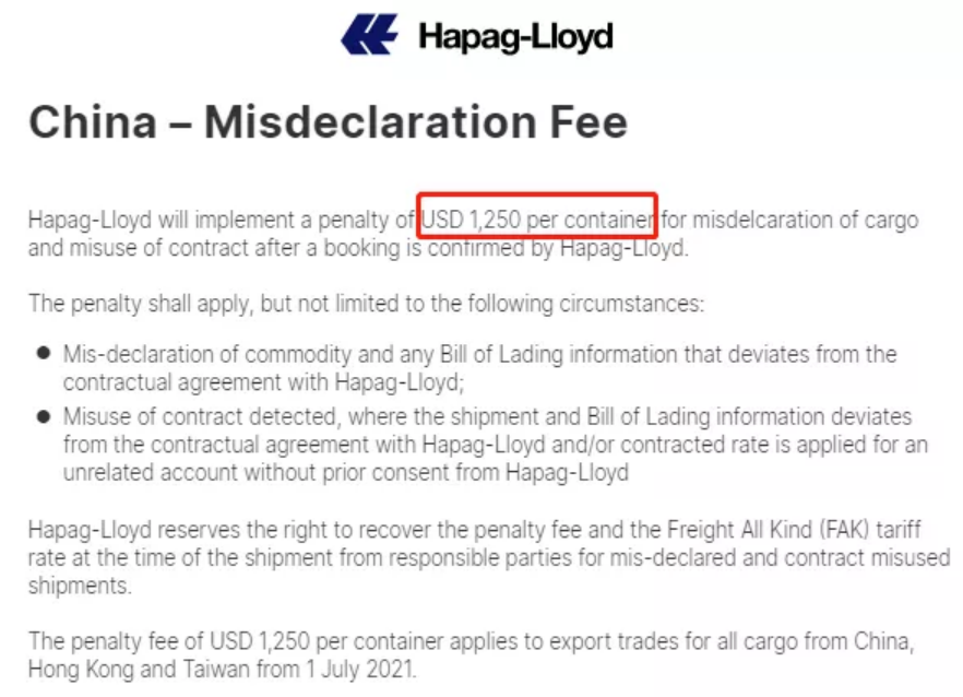 赫伯罗特日前发布通知,在其确认订舱后,赫伯罗特将对货物的错误申报和滥用合同处以每个集装箱1250美元的罚款。