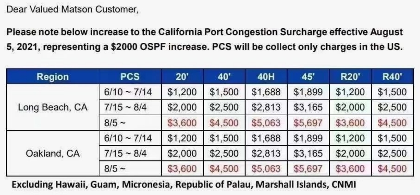 ·8月5日起,美森轮船增加征收港口拥堵费;
