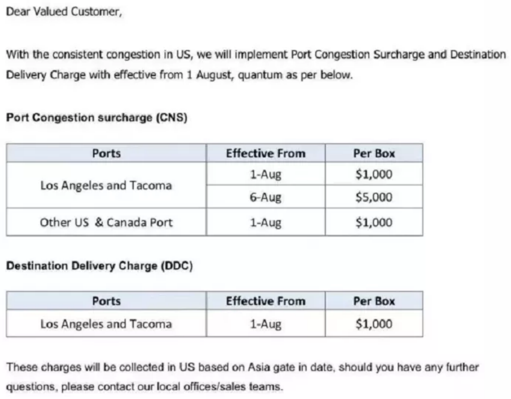 由于美国持续的拥堵,8月1日起,以星轮船将在目的港收取拥堵附加费、交货费。