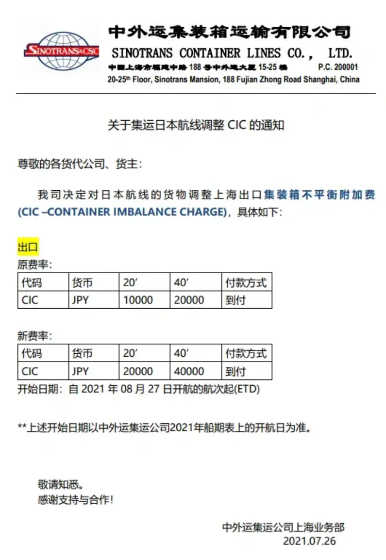 中外运集运决定对日本航线的货物自8月27日开航的航次起,调整上海出口集装箱不平衡附加费CIC ,具体通知如下: