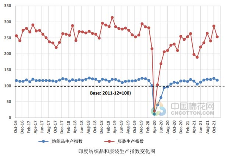 2021年11月,印度纺织品产量同比增长8%,服装产量增长33.4%。2021年4月至11月,纺织品和服装产量同比分别增长47.6%和28.3%。从以上数据可以看出,印度纺织厂已经从疫情中恢复过来,工厂经营状况已经回到了疫情前的水平。