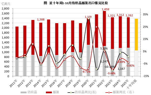 从历史维度观察,近十年1-10月纺织服装出口数据显示,行业已告别高速增长阶段,进入区间调整。特别是2020年以来,出口增速多次出现负增长,2025年1-10月的降幅虽较2020年的-9.48%显著收窄,但较2021年5.20%的正增长仍有差距。