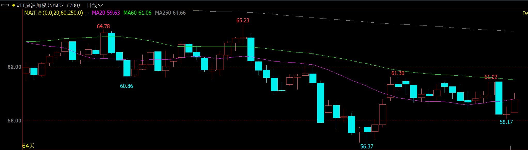 本周以来,国内外原油市场出现大幅波动。其中,国内SC原油期货主力合约周四跌至近三周低点,随后周五又止跌回升,上涨0.66%;WTI原油和布伦特原油在周三重挫后于周四、周五迎来连续反弹,其中WTI原油期价周五盘中一度突破60美元/桶。