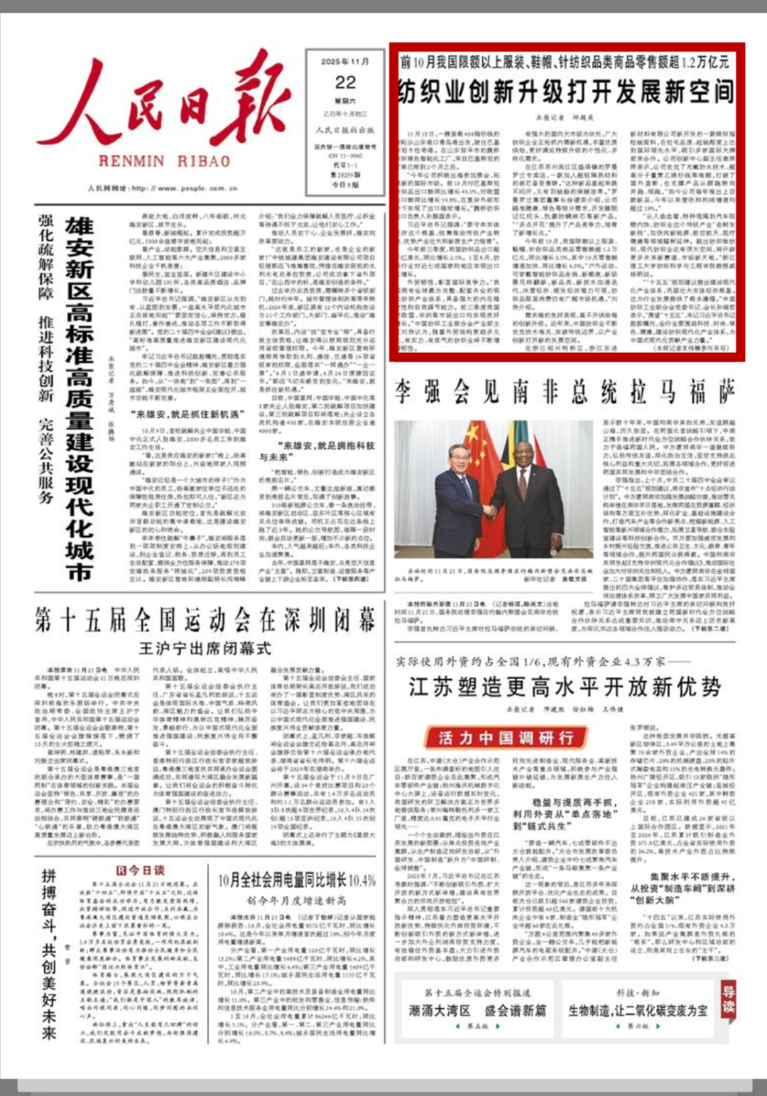11月22日,《人民日报》头版推出长篇报道《纺织业创新升级打开发展新空间》,介绍前10月我国限额以上服装、鞋帽、针纺织品类商品零售额超1.2万亿元背后的“发展密码”,其中报道了盛泽镇纺织企业罗曼罗兰集团抢抓内需新机遇的情况。