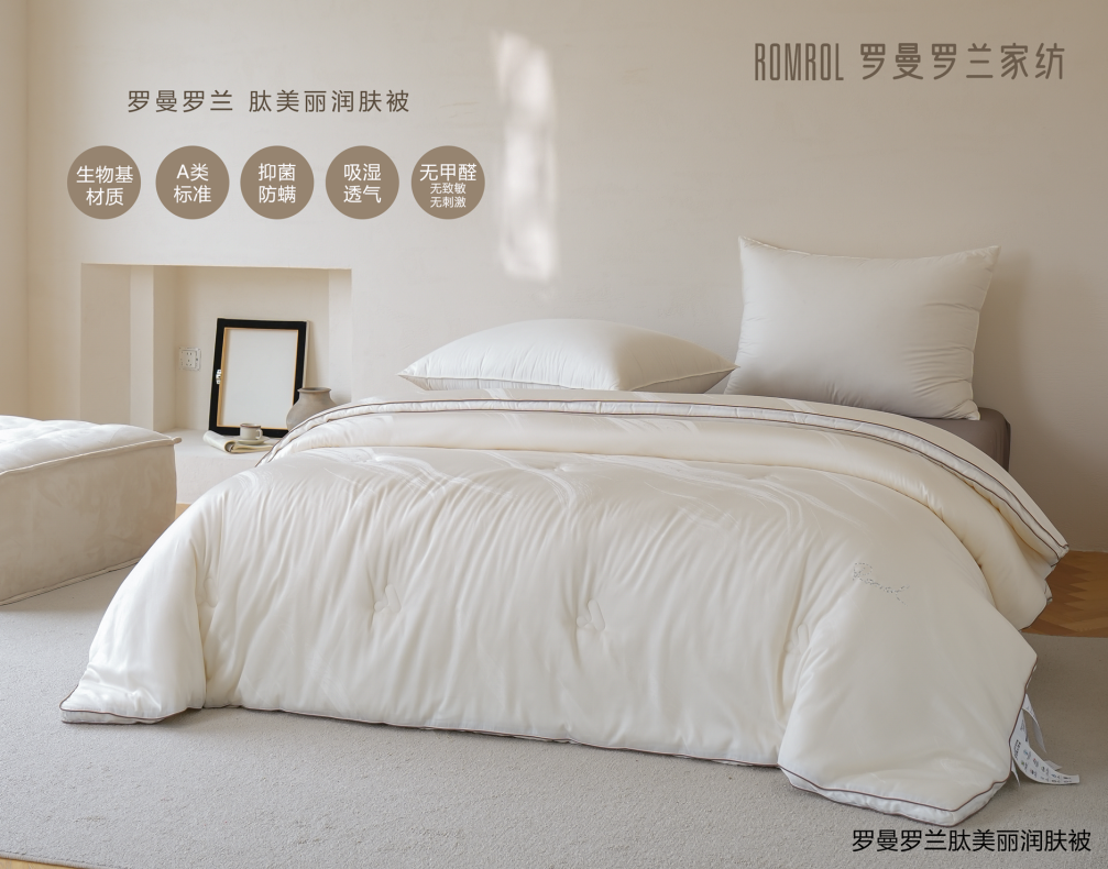 罗曼罗兰家纺深耕行业二十年,始终秉持“源于自然,守护健康”的创新理念,致力于将绿色、生态与科技融入产品设计,为消费者打造安全、舒适、环保的家居生活体验。罗曼罗兰“肽美丽润肤被”这款创新产品不仅具备优异的保温、吸湿与透气性能,更融合多项生态科技,全方位守护肌肤健康。首先被芯透气率高达815mm/s,保温性达到92%,媲美蚕丝被、羽绒被标准;其次,该产品采用天然来源的生物基材,始于自然,可再生可降解,从源头保障材质安全亲肤,天然抗敏,共享原生态健康;更重要的是,被芯运用创新分子锁技术,能在纤维表面构建长效防护层,结合独有抑菌防螨工艺,抗菌率持续高达99%,能显著抑制病菌与螨虫滋生,减少消费者因微生物过敏原导致的过敏风险。该款产品真正实现“睡眠无负担”,为每一夜安眠提供温柔而坚定的健康守护。