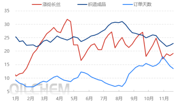 第一,目前聚酯工厂整体库存情况较为良好,对降价去库的需求相对有限。截至11月20日,POY工厂库存在14.1天,FDY工厂库存在19.9天,DTY库存在23.7天,较前期略有增加,但在同比及环比之中并不算过高的库存。