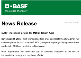 11月20日,巴斯夫宣布从即日起(或根据合同),将上调南亚地区Lupranate® MDI基础产品的价格,涨幅为200美元/吨。此次价格调整是基于运输成本、能源成本及合规管理成本的持续上涨而实施的必要措施。