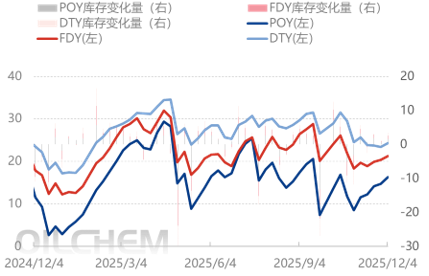 10月底多数涤纶长丝厂商去库效果较好,即使11月行业平均库存水平小幅增加,仍处于可控范围内,因此涤纶长丝厂商稳市的意愿强烈。截至12月4日,本期POY工厂库存在16.3天,FDY工厂库存在21.2天,DTY库存在24.3天。