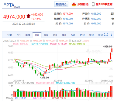 12月17日,PTA主力开盘价为4650点,12月22日盘中,PTA已经逼近了5000点大关,不到一周时间上涨超过了300点。