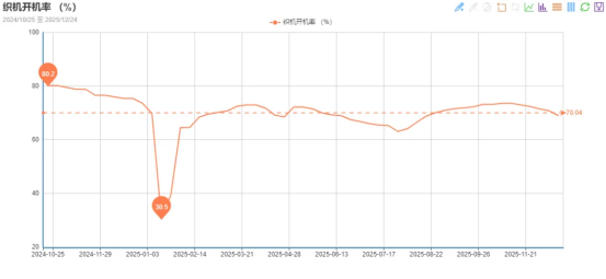 从织造环节数据来看,自前期秋冬订单陆续交付之后,纺织行业整体新增订单情况表现不及预期,拖累织造企业负荷逐步下滑。绸都网监测数据显示,相较于11月上旬的年内最高水平,截至12月19日,样本内织造开机率降至69%,跌幅达4.6个百分点,且这种下滑的趋势仍在延续,随着元旦临近,市场传闻元旦过后下游纺织企业将出现停工、放假等情况,因此,织造开机率仍有进一步下滑的空间。