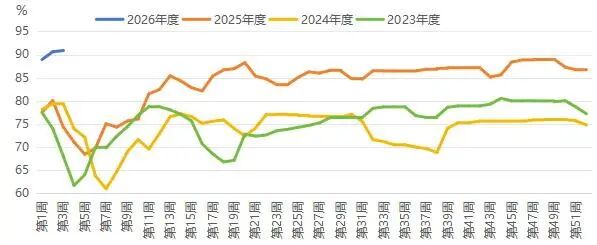 当前下游纺织产业链已全面进入春节前的系统性收缩阶段,对短纤的需求支撑正在快速减弱。这一趋势由两方面因素驱动:一是生产节奏的季节性放缓。随着春节临近,纱线及织造环节开工率规律性下调,对原料短纤的刚性采购需求同步收缩。二是终端订单周期的“青黄不接”。由于海外圣诞与国内新年的订单已基本交付完毕,而决定节后生产的春季新单尚未大规模下达,从而在需求端形成了一个明显的“空窗期”。