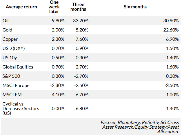 下表详细分析了主要资产类别在事件发生后一周、三个月及六个月内的平均表现。