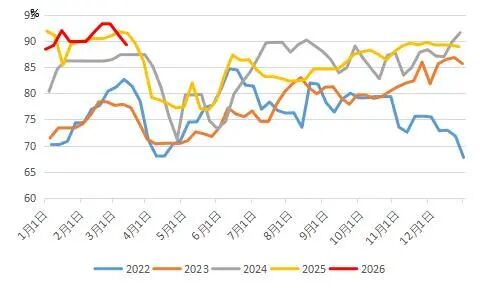 织造端的负反馈有逐步传导至聚酯环节的迹象。本周聚酯长丝产销率持续处于较低水平,产品权益库存快速上升。原计划重启的装置进度偏慢,后期聚酯负荷提升乏力,预估3-4月聚酯平均负荷或将下修至86附近。