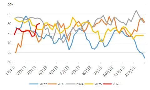 由于3月份PX货源供应影响不大,加之部分工厂备有少量原料库存,目前PTA工厂开工受到地缘影响不大,PTA负荷较春节期间提升了3.5个百分点,维持在80%以上的较高水平,整体仍处于累库状态。下游聚酯负荷连续两周回升,较春节期间提升了7.4个百分点。元宵节后,终端开机率整体提升,加弹综合开工升至74%,织机综合开工升至64%,印染综合开工率升至77%。