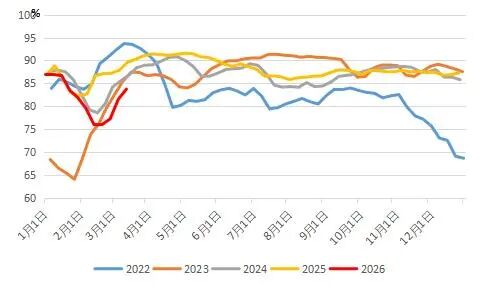 地缘局势不确定性引发原料价格剧烈波动,加大了实体企业经营风险。本周织造工厂采购情绪有所分化,小部分有追高补货,部分谨慎观望为主。终端工厂原料备货整体下降,部分备货少的工厂在15-20天,备货多的工厂延续在3月底-4月底不等。聚酯产品价格波动剧烈,终端坯布价格随之上涨,但主流坯布规格延续亏损状态。尤其是圆机、经编多订单或者缺乏低价原料生产的库存,按成本上涨后定价下的新订单跟进乏力。部分终端缺乏新订单,工厂开工出现下降。