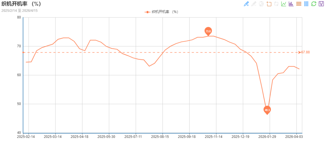 随着原油价格持续高位,化纤价格同步高位波动,这严重打乱了纺织行业的运行节奏。原油上涨时,聚酯厂家集中上调产品报价,但下游市场买气不足,聚酯产销持续低迷;原油回调时,化纤价格止涨回落,聚酯厂家陷入观望情绪,部分厂家出现降价促销现象,终端产销依旧不及预期。这种剧烈的价格波动,让下游纺织企业难以制定稳定的生产与采购计划,加之纺织企业议价能力相对偏弱,难以完全将成本压力向下传导,企业被迫采取减产、停产等避险措施。绸都网监测数据显示,在地缘局势未稳的背景下,终端对化纤价格接受能力持续偏弱,截至目前,样本内织造企业开机率已降至62.1%。